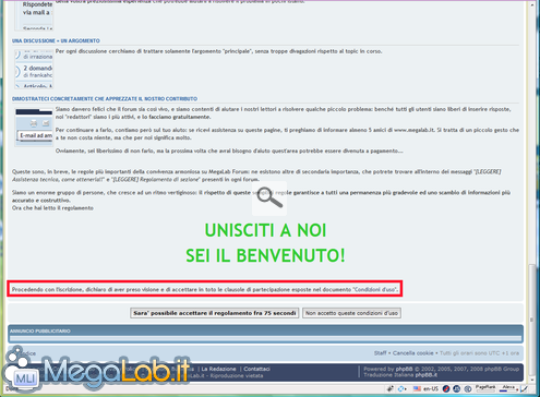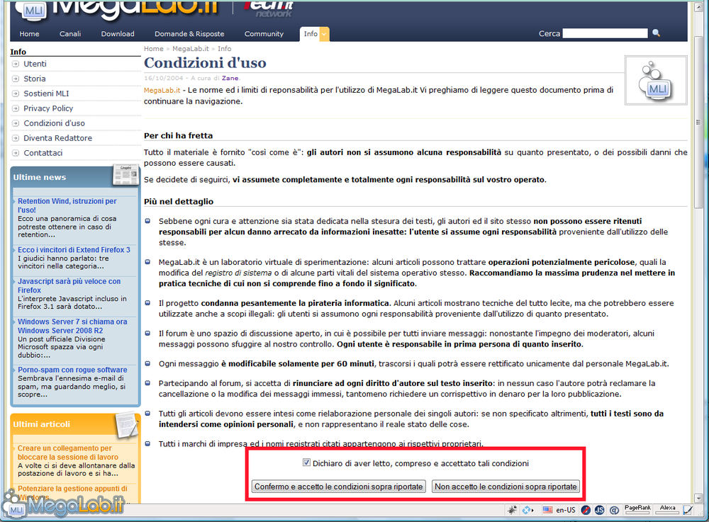 MegaLab.it è, da sempre, un naturale punto di incontro per professionisti ed appassionati di informatica e tecnologia. Un "luogo" da sempre gestito senza eccessivi formalismi o inutili complicazioni per l'utenza. Come ogni circolo che si rispetti però, anche MegaLab.it ha una serie di regole tese a creare un ambiente sereno ed ordinato in cui poter condividere la nostra passione per l'informatica, tutelando i gestori del portale dal punto di vista legale e informando tutti i partecipanti di quanto è possibile aspettarsi (o non-aspettarsi) dalla lettura e/o dalla collaborazione sllo sviluppo del portale. Dopo tanti anni in cui il documento proposto era un semplice disclaimer scritto alla meno peggio, abbiamo deciso ora di avvalerci di una consulenza legale in grado di preparare una informativa più completa e precisa. A partire dal weekend appena trascorso quindi, tutti i nuovi utenti registrati sono chiamati a visionare ed accettare le nuove condizioni d'uso di MegaLab.it A partire da oggi invece, è attiva una nuova funzionalità che prevede l'obbligo da parte di tutti gli utenti registrati da più tempo di accettare esplicitamente il regolamento prima di proseguire. Fino a che la nota informativa non verrà letta e accettata, non sarà possibile eseguire log-in, e quindi accedere alle funzionalità di immissione dati, quali nuovi messaggi per il forum o nuovi contenuti per il portale. In poche parole..?Le condizioni d'uso sono ora scritte in termini più consoni ad un documento di natura legale, ma propongono le solite, vecchie consuetudini già viste su MegaLab.it. In breve: