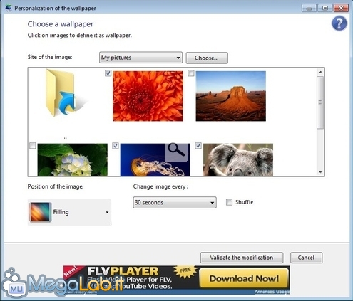 Cliccandola, vi troverete davanti alla schermata principale del programma. Sì, c'è una finestrella pubblicitaria ai piedi della videata: l'implementazione non impiega comunque alcuno spyware o altro programma potenzialmente nocivo Come notate, StarterBackgroundChanger consente di modificare non solo lo sfondo del desktop, ma anche i suoni di sistema ed il salvaschermo. Si tratta comunque di semplici collegamenti alle relative funzioni di Windows, poiché nemmeno l'edizione Starter pone alcun vincolo a tali modifiche. Cliccando su Wallpaper, accederete ad una schermata del tutto simile a quella presente sulle edizioni superiori di Windows 7 Cliccate Choose per scegliere la cartella che contiene le vostre immagini. Da qui, apponete la spunta a tutte quelle che desiderate utilizzare come sfondo: il sistema operativo mostrerà una nuova nuova immagine fra quelle selezionate trascorsi il numero di minuti o secondi specificati nel menu a discesa Change image every. Attivando Shuffle farete sì che la rotazione delle immagini non avvenga in maniera sequenziale, ma sia invece casuale. Prestate attenzione anche al menu a discesa Position of the image: poiché la risoluzione delle vostre immagini sarà generalmente superiore a quella dello schermo del netbook, vorrete probabilmente selezionare qui Filling oppure Adjust, di modo che la grafica venga disposta in maniera da occupare tutta l'area visibile (nel primo caso) oppure sia adattata (nel secondo, consigliabile soprattutto se avete sfondi in formato 16:9). In caso il risultato finale non fosse esattamente quello desiderato, vi raccomando di fare qualche esperimento con questa specifica opzione. A modifica ultimata, cliccate Validate the modification per salvare. Lo sfondo dovrebbe modificarsi immediatamente, ed auto-variare trascorso l'intervallo di tempo specificato Osservazioni prestazionaliIl software non mantiene attivo alcun processo in background. Questo significa che, una volta scelta la sequenza di immagini desiderata ed aver chiuso il programma, non visarà alcuna apprezzabile variazione al carico del sistema. Cambiare lo sfondo su Asus Eee PC, Acer Aspire One ed altri netbook Segnala ad un amico |