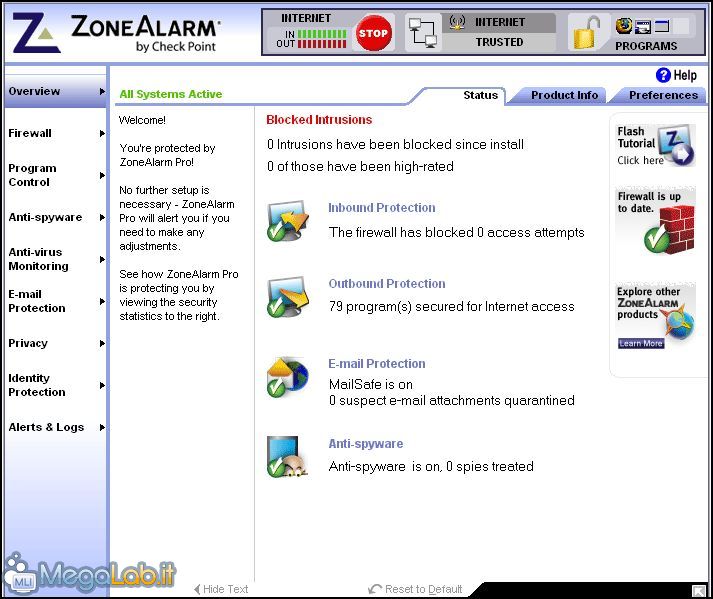 ZoneAlarm Pro combina le funzionalità di un potente firewall, un servizio di protezione d'identità ed un motore di scansione antispyware, per difendere il sistema da spyware, adware, trojan, ecc. Le ultime versioni sono perfettamente compatibili anche con Windows Vista.