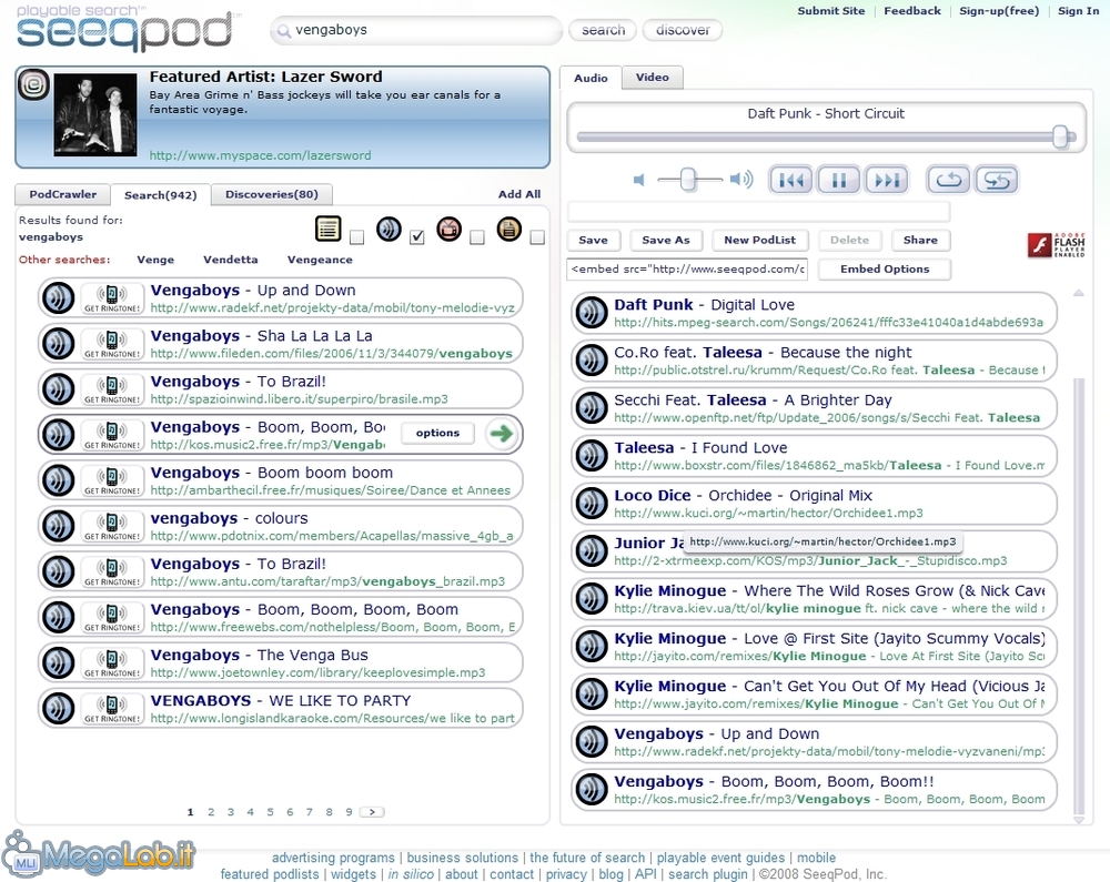 Correlati TagPassa qui con il mouse e visualizza le istruzioni per utilizzare i tag! SongzaSongza è un motore di ricerca dedicato alla musica in streaming: interroga diverse fonti (fra le quali YouTube e imeem) e restituisce tutti i risultati in una sola pagina. Uno dei punti di forza di Songza è l'immediatezza dell'interfaccia, e la possibilità di salvare le proprie playlist in un account personale che consentirà poi di accedere alla scaletta da qualsiasi calcolatore collegato ad Internet. Vi si trovano molte canzoni di pressoché qualsiasi genere, ma fra i risultati è particolarmente elevato il numero di tracce di bassa qualità o comunque incomplete: è quindi quasi sempre necessario provarne almeno un paio prima di trovare una registrazione soddisfacente. >> Songza; Note legali ImeemImeem è un altro interessante portale di intrattenimento a sfondo web 2.0 creato da uno dei papà della piattaforma Napster originale. Invero, imeem non è particolarmente interessante sotto l'aspetto "community". Il punto di forza del servizio è costituito invece dall'alto numero di contenuti a qualità elevata disponibili, e le playlist "a tema" proposte sulla home page: nel momento in cui scrivo ad esempio, sono in evidenza la "Top 10 degli ultimi 10 anni" e la "Top 10 della settimana", raccolte decisamente interessanti per chi, come il sottoscritto, non segue con regolarità le release di nuova musica. >> imeem; Note legali ILikeILike è un portale in salsa sociale dedicato alla condivisione della musica. Si propone come strumento per avvicinare i fan agli artisti, ed offre molto materiale audio di buona qualità. Particolarmente gradevole è la presentazione dei vari risultati: viene infatti offerta la possibilità di ascoltare immediatamente brevi estratti delle varie canzoni, rimandando poi alle pagine più interne per le versioni complete (quasi sempre proposte come filmato di YouTube). >> iLike; Note legali SeeqPodSul finire di Marzo 2009, TechCrunch ha rivelato che SeeqPod potrebbe essere sull'orlo del baratro: l'azienda alle spalle del servizio ha infatti depositato la richiesta di bancarotta. A dicembre 2009, il sito pare aver cessato le attività. SeeqPod si propone come un motore di ricerca per contenuti liberamente accessibili presenti su web. In realtà, è un potentissimo player multimediale, in grado di consentire l'accesso ad una mole di contenuti davvero sostanziosa. A far la parte del leone è l'eccellente interfaccia, grazie alla quale l'utente può cercare i titoli delle canzoni o i nomi di artisti che desidera ascoltare, ed aggiungere i risultati di proprio interesse ad una pratica playlist che può anche essere salvata nel proprio account. I risultati sono sempre corretti, e vengono ritornate solo canzoni complete e di ottima qualità. Da provare! >> SeeqPod; Note legali SkreemR, Deezer, BeeMP3, Thesixtyone SHOUTcast, YouTube, Last.fm, The Hype Machine Segnala ad un amico |