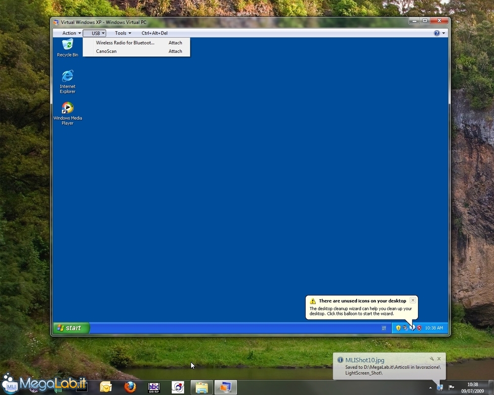 Ad operazione terminata, o nel momento in cui la procedura guidata vi chiedesse di collegare il dispositivo, cliccate sulla voce USB della barra dei menu di Windows Virtual PC e quindi selezionate la voce relativa al componente che desiderate utilizzare (CanoScan, nel mio caso)