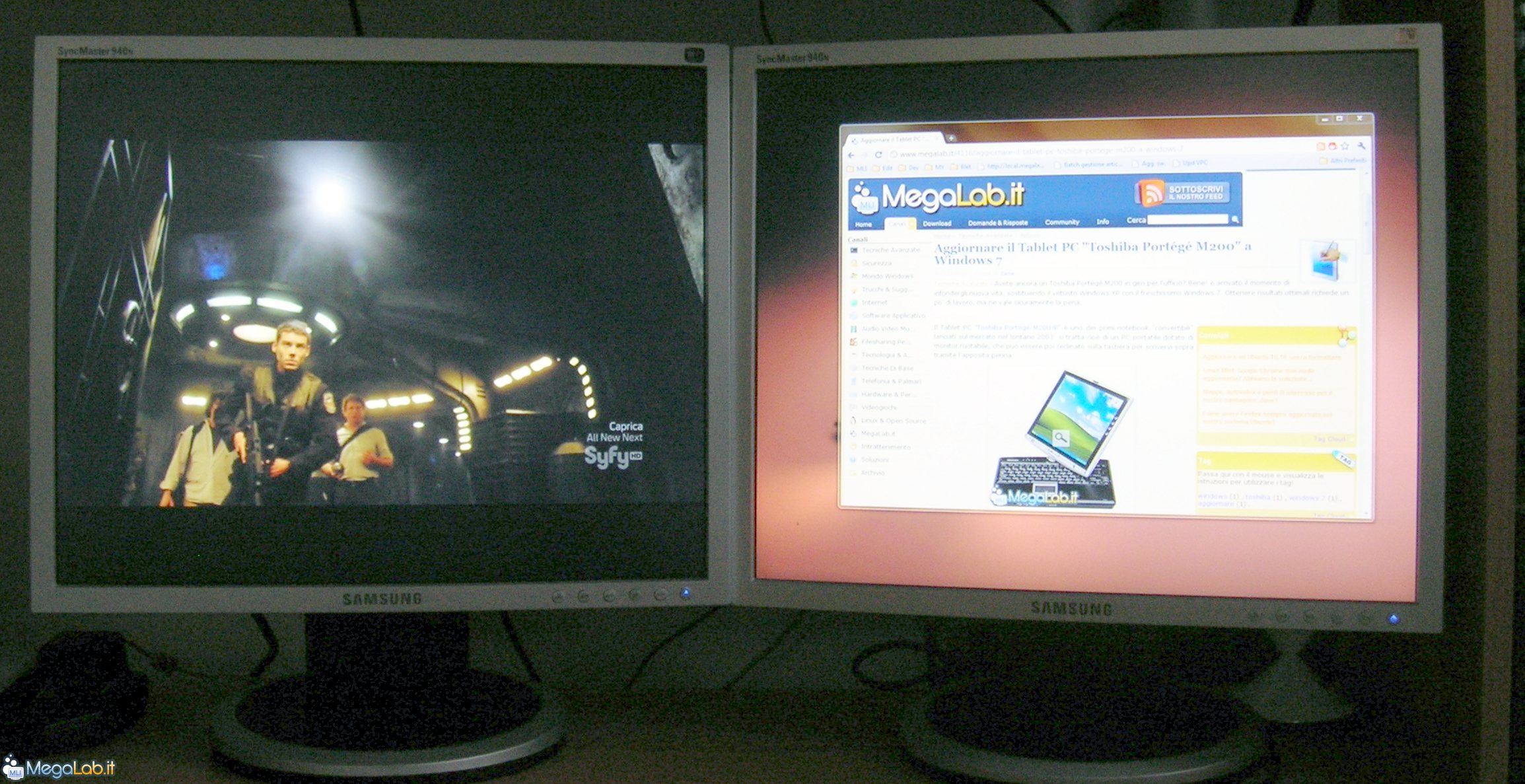 Una critica a quanto appena detto potrebbe riguardare l'uso dello finestre massimizzate, passando da un'applicazione all'altra tramite la combinazione da tastiera Alt+Tab. Non metto in dubbio che, disponendo di un display solo, saltare da una finestra all'altra possa essere una scelta più azzeccata rispetto a lavorare a finestre affiancate. Se però vi trovate a creare documenti particolarmente lunghi o che prevedono passaggi o termini complessi da riportare con la massima accuratezza, quanti istanti perdete ogni volta fra salto e "riadattamento mentale" al nuovo contesto? e se avete molteplici applicazioni aperte contemporaneamente (magari non utilizzate in questo momento), quanto tempo perdete richiamandole erroneamente? E, ancora, vogliamo parlare della fase di revisione? "Tsk, io ho un widescreen da 23 pollici... "Un singolo display a diagonale elevata non è, a mio avviso, una soluzione valida quanto una configurazione dual-monitor. Il problema risiede, fondamentalmente, nella risoluzione orizzontale massima e, di conseguenza, nel numero di pixel visualizzabili contemporaneamente. Due display da 19 pollici con una risoluzione orizzontale di 1280 pixel l'uno (è lo scenario raffigurato nelle immagini di inizio pagina), consentono di visualizzare 2560 pixel alla volta. Un singolo monitor da 23 pollici, per quanto di buona qualità, difficilmente è in grado di andare oltre i 1920 punti... il 33% in meno! Inoltre, un monitor da 1920 pixel offre appena 640 pixel in più rispetto agli screenshot singolo-display presentati in precedenza: questo significa che, suddivisi per le due finestre visualizzate in contemporanea, si otterranno appena 320 pixel in più per schermata.... insufficienti a sbloccare la situazione in maniera risolutiva. L'unica circostanza in cui un singolo video "gigante" sia equiparabile ad un dual-monitor è quando la sua risoluzione orizzontale è uguale o superiore ai 2560 pixel (ovvero 1280 pixel, la risoluzione ideale per il web moderno, per due, di modo da visualizzare due pagine affiancate). A novembre 2010, solo un pugno di apparecchi raggiungono tale risoluzione, ed hanno tutti prezzi superiori ai 1.000 $. Tutti i numeri della produttivitàArrivati a questo punto, credo sia ormai piuttosto chiaro che il dual-monitor porti con sé una serie di vantaggi di primo piano. Ma "di quanto" migliorano le cose, esattamente? Sebbene sia difficile parlare in senso assoluto, alcuni numeri possono aiutare. Microsoft Research cita uno studio condotto da terzi nel quale è stato rilevato un miglioramento della produttività compreso fra il 9 e il 50% una volta che il campione sia stato dotato di un secondo display. Una rilevazione condotta presso la direzione di un ospedale canadese parla di un miglioramento delle prestazioni pari al 3% circa, capace però di tradursi in un risparmio netto di 5.530 € nei costi di gestione. Un articolo edito da New York Times fa riferimento ad un sondaggio più informale, nel quale si cita un +30% nel rendimento dei lavoratori dual-monitor. Molti studi sulla materia sono stati condotti da NEC ("fino al +10%") ed altri, ma le conclusioni sono sempre le stesse: i benefici sono tangibili e facilmente misurabili in pressoché qualsiasi scenario. Dite "no" al tri/quad/multi-monitorConsiderati i costi irrisori dell'attrezzatura necessaria (ne parleremo diffusamente nelle prossime pagine), è facile farsi prendere la mano e valutare la possibilità di affiancare anche un terzo o, addirittura, un quarto monitor. Ho personalmente svolto alcune prove in queste situazioni, ottenendo risultati abbastanza deludenti: in uno scenario di produzione "da ufficio", i benefici che si ottengono andando oltre due display sono decisamente modesti. Il limite di fondo è dato dal fatto che sul terzo monitor e successivi difficilmente si sa "cosa metterci": certo, potete piazzare il programma di gestione della posta elettronica per vedere in tempo reale le nuove e-mail in arrivo, o la finestra di messaggistica istantanea per chattare mentre lavorate, o, ancora, qualche "gadget/widget" per il desktop, utile a riportare l'andamento azionario o le previsioni del meteo.... ma quello che dovete chiedervi è: quanto, di questo continuo flusso di informazioni aggiuntive, potete realmente processare prima che il tutto si traduca in un'interruzione continua che vi impedisca di lavorare sui primi due schermi? e, ancora, se proprio è necessario essere interrotti in tempo reale, non basta una notifica a pop-up dal giusto programma su uno dei primi due schermi? Non mi fraintendete: se avete una spiccata capacità di concentrazione, lo spazio sulla vostra scrivania abbonda, desiderate guardare filmati mentre lavorate sugli altri due schermi, tenere costantemente d'occhio una webcam di sicurezza o operate in frenetici ambienti finanziari in cui è vitale visualizzare moltissimi dati contemporaneamente..... aggiungere altri display non vi causerà un danno. La mia raccomandazione di orientarsi sul dual è dovuta al fatto che, in scenari standard, c'è il rischio concreto che i monitor supplementari vengano realmente sfruttati solamente in pochissime circostanze, o finiscano per essere più una distrazione che altro. Di videogiochi e filmatiA voler essere del tutto esaustivi, l'approccio dual-monitor risulta scarsamente interessante quando si parla di videogiochi, di home theather o di tutte quelle applicazioni che rendono il meglio solamente in fullscreen. Il limite è costituito dal fatto che, sebbene con alcune eccezioni, queste applicazioni non sono in grado di gestire il doppio schermo in maniera appropriata. Riproducendo un filmato, per quanto questo sia ad altissima risoluzione, verrà sfruttato un solo monitor: Il discorso è del tutto analogo quando si parla di videogiochi L'unica soluzione, in questo caso, è quella di spegnere il display secondario. Non è, naturalmente, una "penalizzazione" rispetto allo scenario in cui fosse in uso un singolo monitor, ma è comunque una