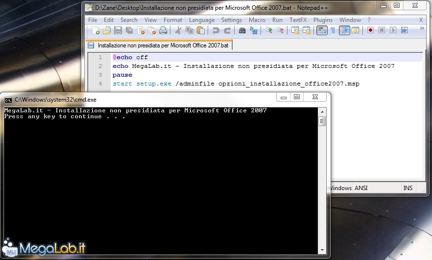 L'archivio contiene un file batch che, una volta copiato nella cartella di origine di Microsoft Office 2007 unitamente all'apposito file di risposta, consente di avviare l'installazione automatica. Par maggiori informazioni circa la creazione del file di risposta, fare riferimento all'articolo correlato. In caso non si desiderasse la conferma Premete un tasto per continuare, è sufficiente modificare il file ed eliminare il comando pause.