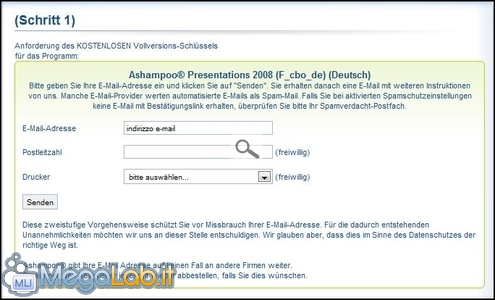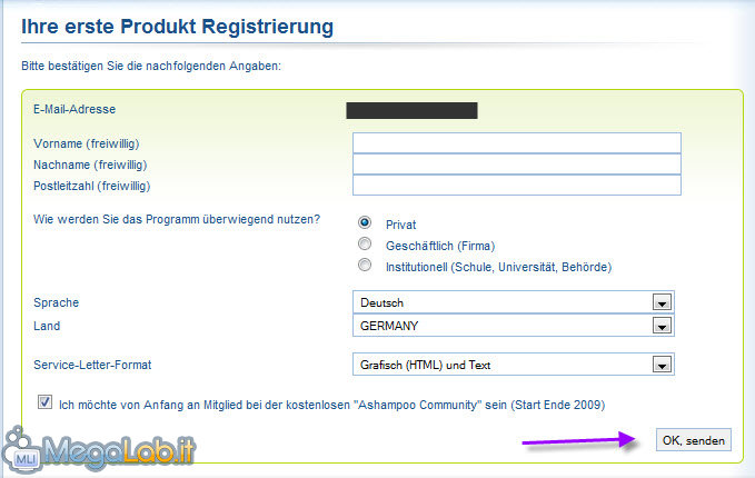 Vi si aprirà una nuova pagina con un altro form già precompilato con i vostri dati: cliccate semplicemente su OK, senden. Quasi immediatamente riceverete una seconda e-mail con la vostra licenza.