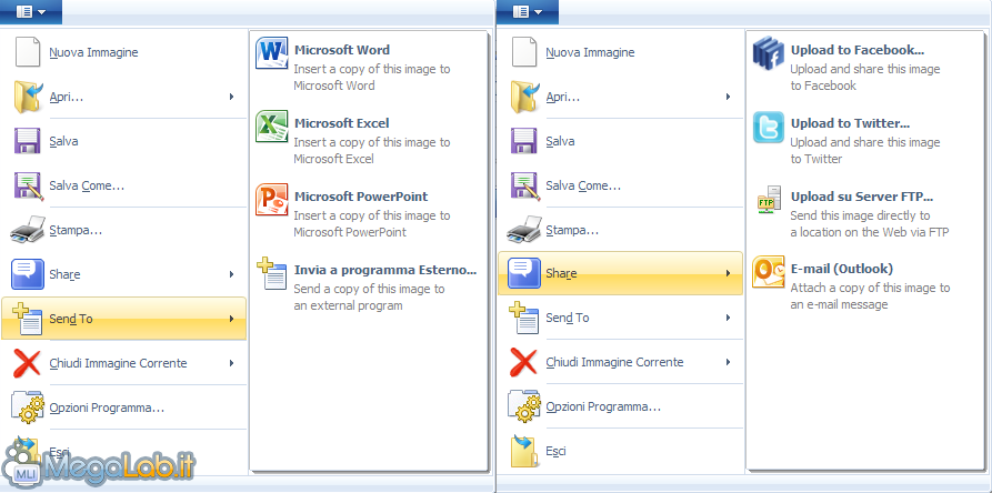 Analizziamole tutte, per poter comprendere la loro utilità. Editor ImmaginiApribile anche con un doppio clic nell'iconcina di PicPick, questa utility ci permette di modificare uno screenshot, o anche una qualunque immagine presente nel PC. L'interfaccia dell'applicazione presenta una "barra multifunzione" che ricorda molto (forse troppo?) quella della versione rinnovata di Paint presente in Windows 7; il risultato di tale è molto apprezzabile visivamente, ma a mio parere risulta un po' troppo simile al sistema Scenic presente in alcuni software Microsoft. L'editor risulta molto comodo per effettuare al volo piccoli ritocchi delle proprie immagini in particolare per inserirvi frecce, box, scritte e per pixellare i caratteri, magari prima di caricarle sul proprio sito web o su qualche forum. Se invece speravate di trovare in PicPick uno strumento professionale per la modifica delle foto, sono costretto a deludervi: per questo dovete rivolgervi ad altre soluzioni più valide. Dalle opzioni dell'editor è possibile, nei menu Sharee Send To, caricare direttamente le immagini sui social network Facebook e Twitter, su un server FTP, su Outlook perché le immagini siamo inviate come allegati, e si può anche inserirle su Word, PowerPoint ed Exel, o su un'altra applicazione a scelta. Ho provato personalmente queste funzioni, a parte Upload in Twitter...non essendo registrato a questo social network, e posso confermare che funzionano tutte, anche il caricamento su Facebook che è supportato in versione beta. CatturaQuesta voce è, di fatto, la più importante di tutto il programma, in quanto ci permette di svolgere l'operazione che maggiormente ci interessa, ovvero catturare screenshot dello schermo.