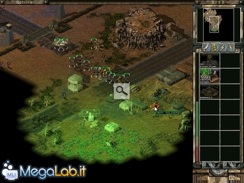 Questo vi consentirà di incrementare il numero di crediti riportato in alto a destra, necessari per costruire la fabbrica di mezzi corazzati (War Factory) e la caserma (Barracks)