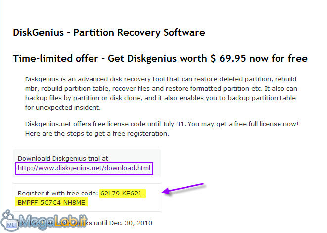 DiskGenius è un software professionale in grado di ripristinare la partizione eliminata, ma non solo: oltre a gestire completamente le partizioni (creazione, eliminazione, formattazione) fornisce anche strumenti più potenti come il recupero dei file persi e delle partizioni perse, ecc.... insomma un programma completo, utile e per di più adesso gratuito. Compatibile con Windows 2000/XP/2003/Vista/2008/7. Il programma ha un valore di circa $70, ma fino al 31 Luglio c'è la possibilità di attivarlo gratuitamente attraverso un codice promozionale generato per l'occasione... ottenere la propria copia gratuita è molto semplice: Collegatevi con questa pagina, scaricate il programma cliccando sul link presente ed installatelo: nel frattempo annotatevi la licenza promozionale presente sempre nella stessa pagina. Terminata l'installazione attivatelo: al primo avvio del programma inserite la licenza e cliccate su Online Register (N.B. in Nome ed Indirizzo e-mail potete inserire quello che volete).
