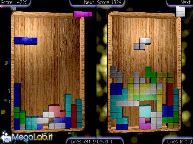 TagTetris 3000Tetris 3000 è una bella versione di Tetris con molti pezzi dalle forme strane. Durante il gioco, che deve essere installato, potete ascoltare dei file audio, in formato midi, di canzoni piuttosto famose. Tra le condizioni d'uso del gioco c'è il cambio di home page del browser e, se la volete rimodificare, il gioco viene disinstallato. Ogni tanto c'è il bonus "bomba" che vi permette di distruggere un gruppo di pezzi. TowerTower è un Tetris in 3D piuttosto particolare dove è necessario costruire una torre incastrando i pezzi che cadono dall'alto senza lasciare buchi nella costruzione. Si può usare il mouse o le frecce direzionali per posizionare i mattoni nella torre. Con le frecce orizzontali si può girare la torre per cercare degli spazi ancora liberi, con quella verticale si può girare il pezzo in caduta, con la freccia inferiore si velocizza la discesa del pezzo Il gioco si può scaricare da questo indirizzo e non richiede installazione. Non è per niente facile passare di livello e finire la torre! XwelltrisXwelltris permette di scegliere il livello di partenza e anche la difficoltà a seconda del numero di pezzi utilizzati per completare lo schema. Decisamente complicato con lo schema con vista dall'alto e poi ruotato, lo raccomando solamente agli amanti dei Tetris veramente complicati. Nessuna musica o effetti sonori durante il gioco. ZetrixZetrix non richiede installazione, ha una buona grafica ed è tradotto anche in italiano. Ha il supporto multiplayer con musica ed effetti sonori che accompagnano il gioco. Come ho detto in precedenza sul mio portatile andava in errore per un problema con la scheda audio, ma ci avevo giocato in passato su un PC diverso ed è una versione di Tetris veramente bella. Gravitris, Hacker, Sherene's, Tetris 2000 Pagine