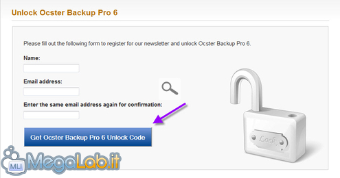 Ocster Backup Pro è un ottimo programma che consente di pianificare in maniera del tutto automatica l'archiviazione dei dati: basta specificare la posizione, le cartelle da mettere al sicuro e il momento in cui avviare il processo. I dati inoltre possono essere protetti con una password e cifrati tramite l'algoritmo Aes 128/256 bit. Compatibile con Windows XP/Vista/7. Per ricevere la propria licenza basta semplicemente collegarsi con questa pagina, inserire le informazioni richieste e cliccare sul pulsante Get Ocster Backup Pro 6 Unlock Code. Nella pagina successiva un messaggio vi confermerà l'invio di una e-mail all'indirizzo richiesto. Nella e-mail troverete un link sul quale cliccare per completare la registrazione. Nella pagina successiva visualizzerete la vostra licenza, che comunque vi verrà inviata anche via e-mail. Scaricate il programma, installatelo e quando richiesto attivatelo in versione completa. Segnala ad un amico |