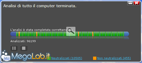 Lo scanner di Panda per ogni minaccia trova più di un file infetto, infatti i file neutralizzati sono 10505 ben superiori ai virus contenuti nella cartella inserita nel computer, che ne contava 9810.
