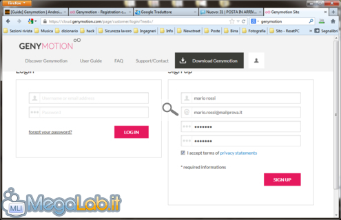 I tablet sono sempre più diffusi, questo grazie alla praticità che offrono. Oramai le tavolette tendono a sostituire il computer e molti utenti che ancora non hanno un tablet si pongono una domanda: posso sostituire il mio PC in tutto e per tutto con un tablet? Per darsi una risposta a tale dilemma c'è una facile soluzione: possiamo installare il sistema operativo Android sul nostro PC così da poter testare le caratteristiche e le funzioni che offrono i tablet. Dopo di che, quando saremo davvero convinti della sua utilità, potremo procedere con l'acquisto ragionato del nuovo tablet. Importante considerare un aspetto in questa prova e cioè, le prestazioni dell'emulatore di Android dipendono molto dalla configurazione hardware a nostra disposizione. Vediamo adesso la procedura da seguire. Effettuiamo la registrazione Innanzitutto colleghiamoci al sito www.genymotion.com, selezioniamo Sign up e successivamente compiliamo i campi con i nostri dati personali. Infine accettiamo le condizioni d'uso e ri-clicchiamo su Sign up per terminare la procedura di creazione dell'account al sito Genymotion. Scarichiamo l'emulatore In seguito alla registrazione riceveremo un'e-mail con il link da cliccare per effettuare l'attivazione dell'account. Torniamo sulla home page di Genymotion ed effettuiamo il Log in con le nostre credenziali. A questo punto nella finestra che si aprirà clicchiamo sul tab Download Genymotion e di seguito clicchiamo su Windows 32/64 bit (with VirtualBox). Installiamo e... iniziamo Una volta avviato e terminato il download del file genymotion-1.1.0-vbox.exe proseguiamo con l'installazione. Il file installerà tutte le librerie di VirtualBox necessarie per emulare il sistema operativo Android sul nostro PC. Inseriamo le credenziali Avviamo Genymotion e clicchiamo su Yes. Logghiamoci inserendo le nostre credenziali di accesso e di seguito clicchiamo su Connect per creare il nostro dispositivo virtuale. Creiamo l'immagine Adesso dobbiamo entrare in Virtual device avaible from the Genymotion cloud e selezionare il device da emulare. Scegliamo Nexus 7 - 4.2.2 - with Google Apps - Api 16 - 1280x800. Clicchiamo su Add in basso alla finestra per effettuare il download dell'immagine da installare in VirtualBox. Eseguiamo l'installazione dell'immagine Il seguente passo consiste nel cliccare sul tasto Next, a questo punto attendiamo il termine del download e clicchiamo di seguito ancora Next. Adesso premiamo su Create per produrre il nuovo device virtuale e aspettiamo che termini la procedura in pochi secondi. Al termine non ci rimane che cliccare su Finish . Inizia l'emulazione Adesso il nostro tablet virtuale è installato e pronto per essere usato. Clicchiamo sul pulsante Play che si trova nella barra degli strumenti di Genymotion. Nella seguente schermata che appare, clicchiamo sul pulsante Stop asking me. Necessitiamo di un account Gmail Una volta avviato il sistema operativo Android, dobbiamo cliccare su Start nella schermata di scelta della lingua predefinita, quindi impostiamo il nostro account Gmail, necessario per accedere a tutte le funzioni del tablet virtuale. Il tablet è pronto! Non ci rimane che completare la configurazione di Android inserendo la data e l'ora e di seguito cliccando su Finish. Adesso si aprirà la Home del nostro nuovo tablet virtuale. Non ci resta che "smanettare".
